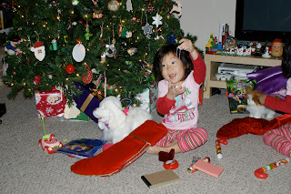 | Kacee opening her first gift ever. She really did not know what to do. By the end of the Christmas season, she was a pro at unwrapping presents. |